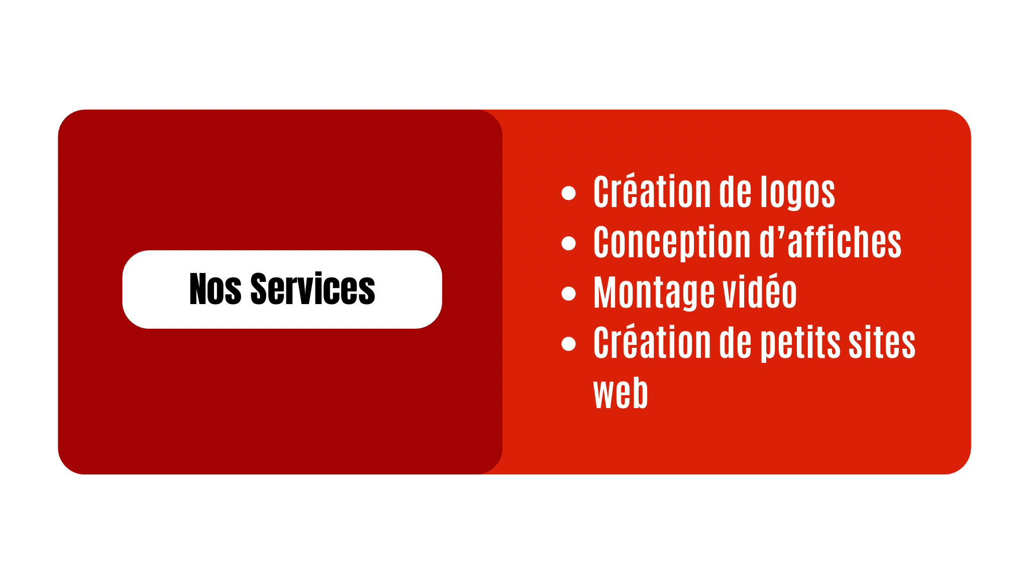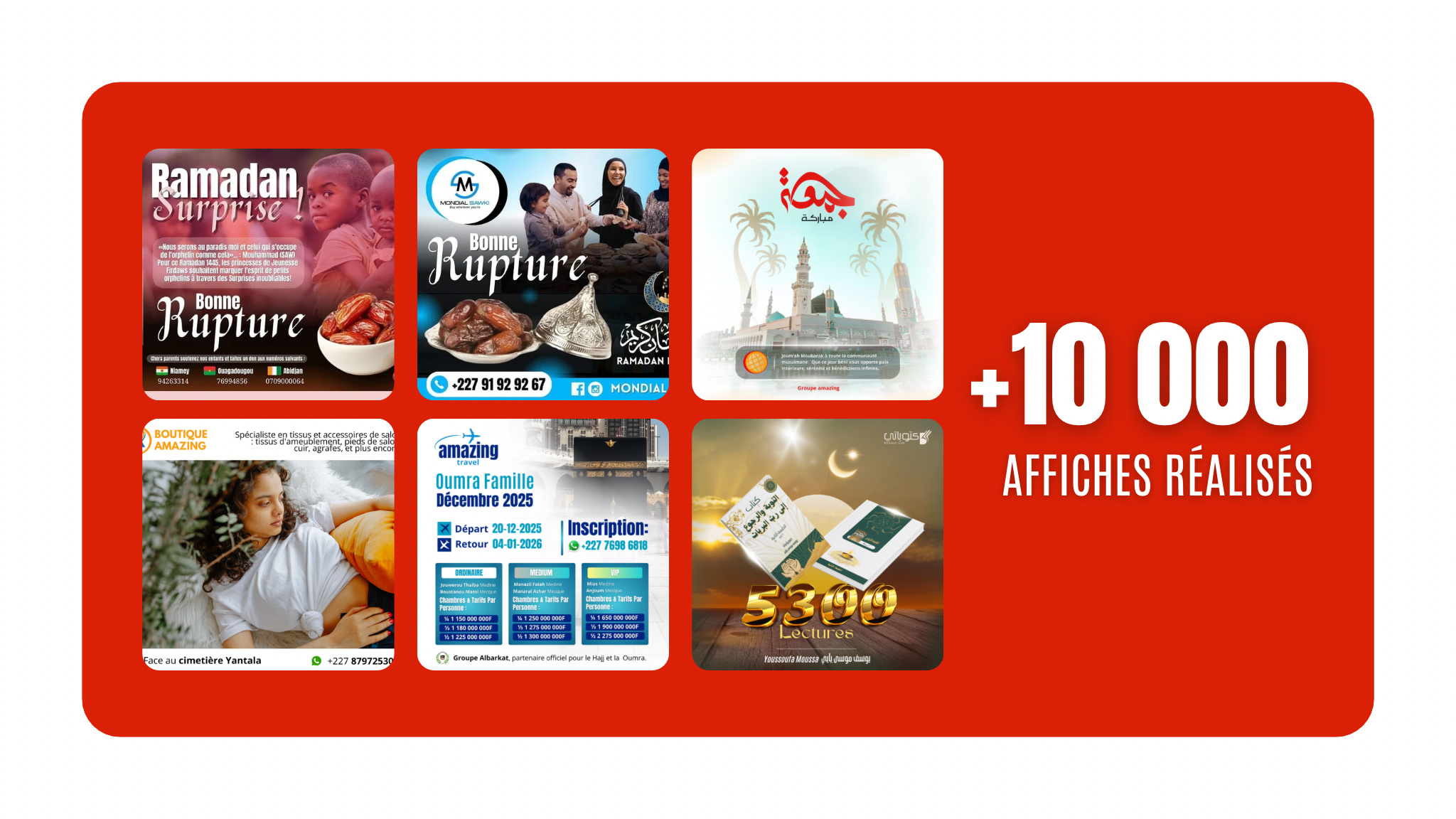 Nous réalisons tous types d’affiches, qu’elles soient numériques (pour les réseaux sociaux, couvertures de livres et carnets, etc.) ou imprimées (jusqu’à une taille maximale de 200 × 85 cm : cartes de visite, flyers, kakémonos, panneaux publicitaires, etc.). Les frais varient entre 5 000 F - 20 000 F selon le projet. Délai de livraison : 24 à 72h.
